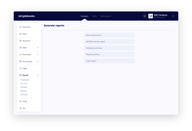 As you go about adding employee details, the payroll tool will automate this for you. Select “Payrun” under the payroll tab to check total EFT/ETF and taxes or select the tab “Employees” from the dropdown and click on an employee’s name to view it on an individual level.