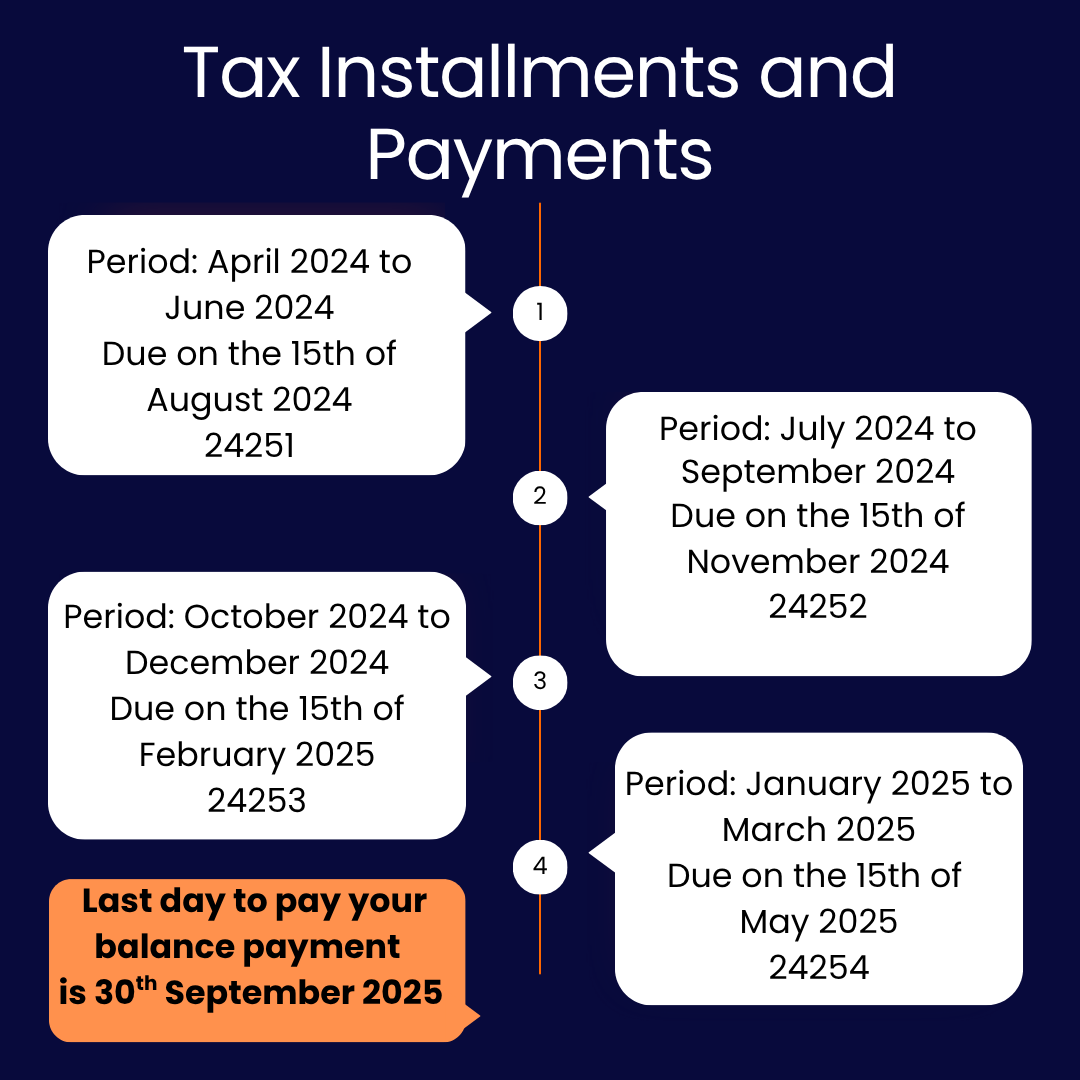 Mark your calendar, because staying ahead starts with knowing your important deadlines. You can pay your tax by breaking it down into smaller, easier payments throughout the year in quarterly installments for the 2024/2025 assessment year.